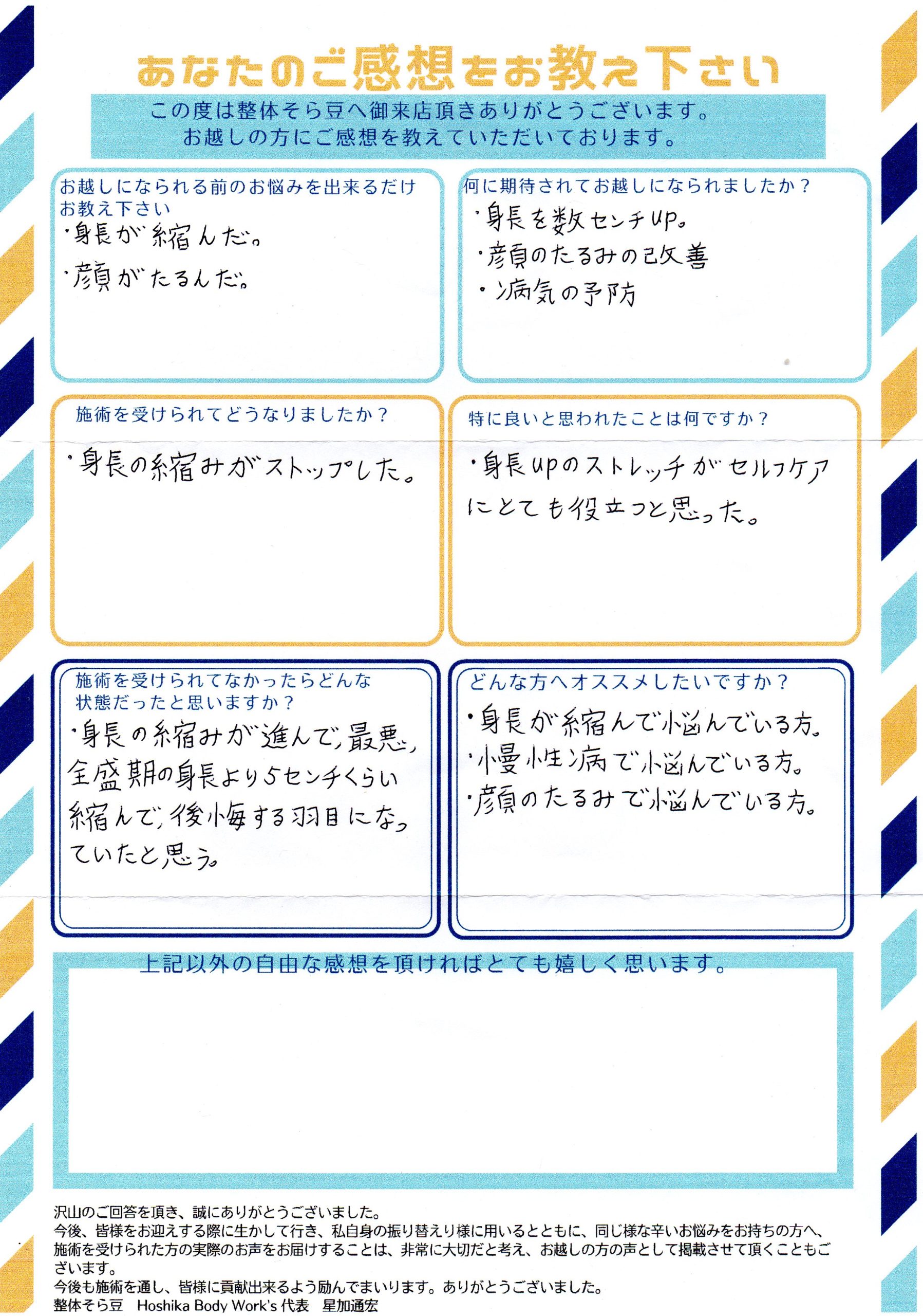 身長が縮んで悩んでいる方、慢性病で悩んでいる方、顔のたるみで悩んでいる方。