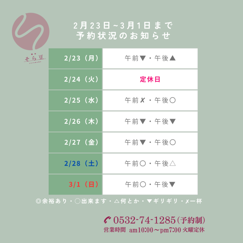本日は来週【2月23日月曜日から3月1日・日曜日】までの予約状況のお知らせになります。